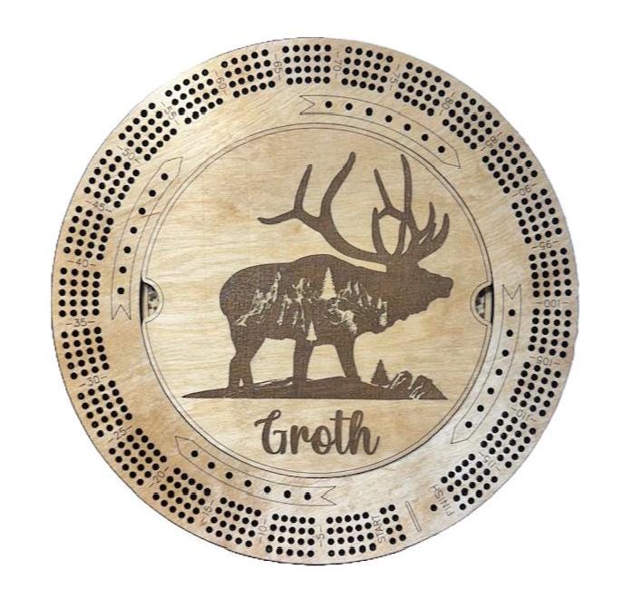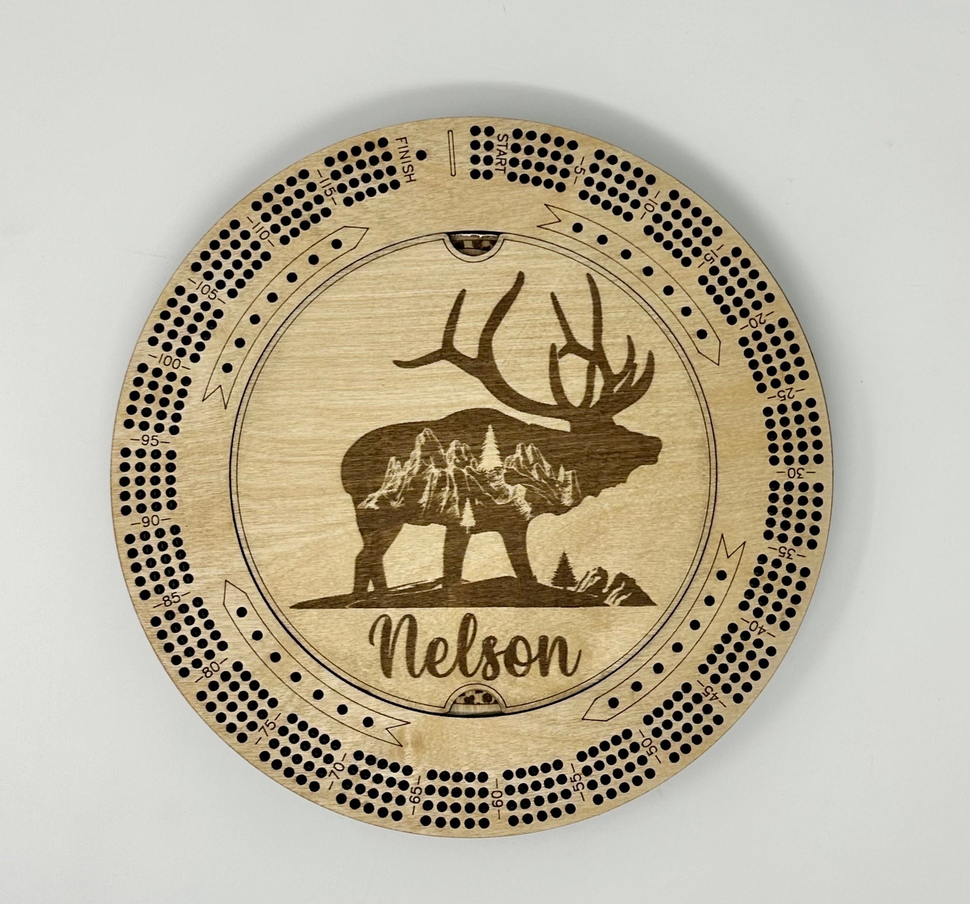 Custom Cribbage Board Moose Elk Buck Mountains Hunting Round Cribbage Board 4 Track Cribbage Board with Pegs Game Board Lover Unique Gift