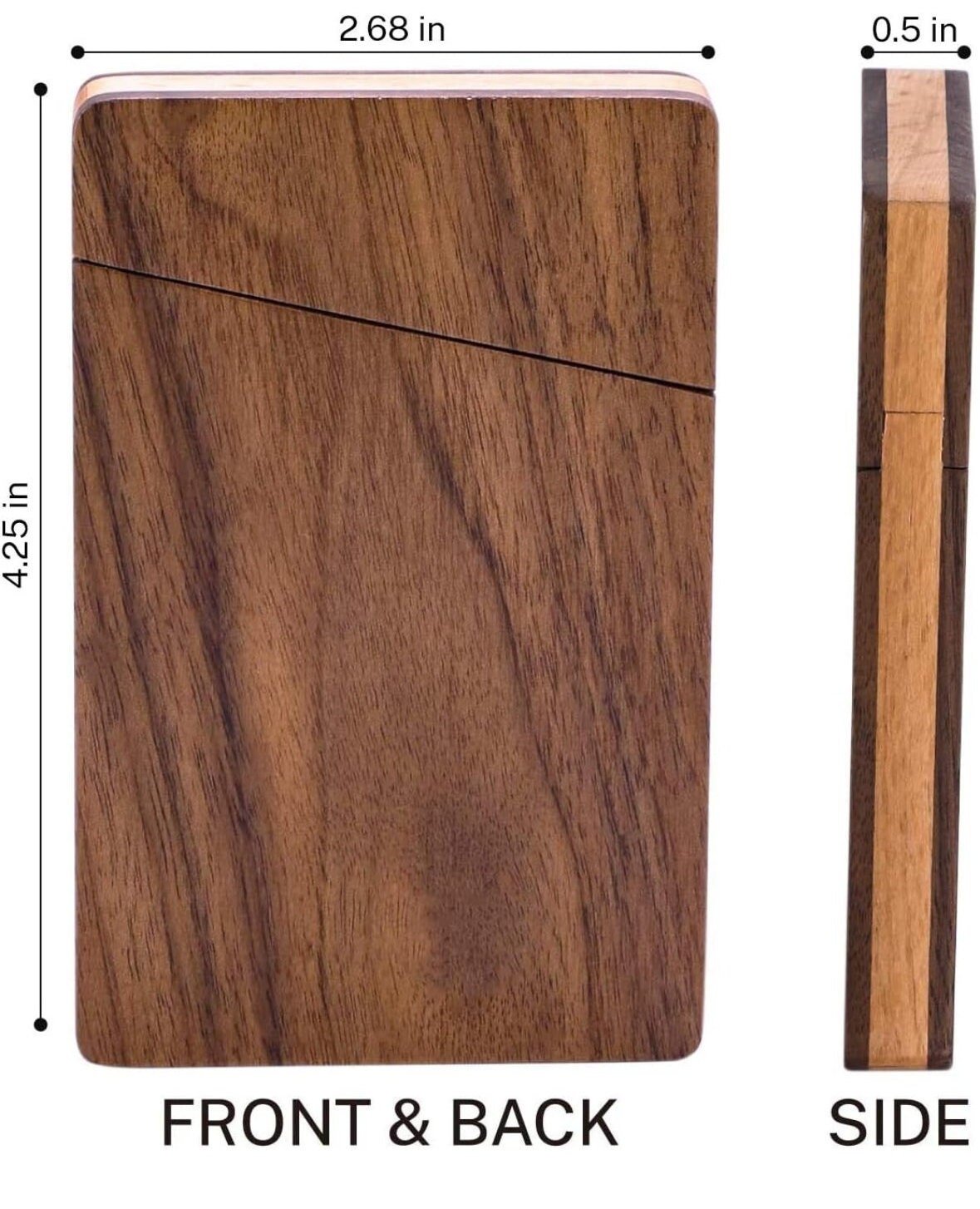This business card holder is made of natural walnut wood and can hold between 12-15 business cards, depending on the thickness of the cards. Its dimensions are 4.25" x 2.7" x 0.5" inches. The magnetic closure is strong and durable, ensuring that your cards are safe and secure. With the option to personalize it by engraving your name, company logo, or any other important information, this card holder will give a professional look to anyone who uses it.